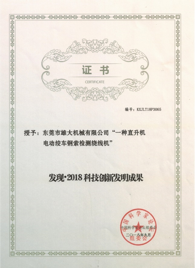 2018年9月12日我司受邀参加由著明科学家、时任全国人大常委会副委员长、中国科协主席周光召院士在北京主办的主题为:“建设世界科技强国与新时代科技创新”的论坛。展示我司科技成果《一种直升机电动绞车钢索检测绕线机》,并获得中国科技学论坛颁发的“2018科技创新发明成果”证书。